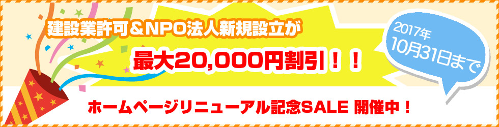 当事務所ホームページのリニューアルを記念して、建設業新規許可及びNPO法人新規設立手続について、最大20,000円の料金割引キャンペーンを実施致します。詳細は下記のとおりです。この機会に是非、当事務所をご利用ください。 なお、当事務所の通常の料金については、こちらの料金表でご確認ください。