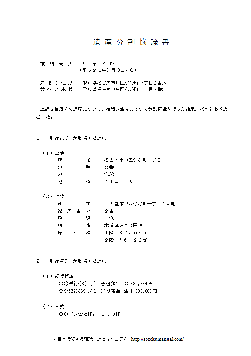 (被相続人甲野太郎に相続人として配偶者甲野花子と子甲野次郎がいた場合)